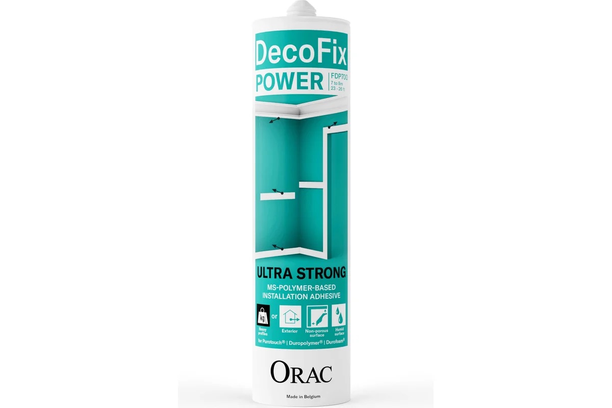 Клей монтажный Orac FDP700 DecoFix Power 290 мл на основе MS-Polymer. Предназначен для приклеивания на стены и потолок тяжелых молдингов, карнизов, панелей. Подходит для приклеивания на непористые или влажные поверхности. Клей может также применяться для склеивания различных материалов в других областях. Эксплуатация как внутри, так и снаружи зданий и сооружений при температурах от -60°С до +100°С.