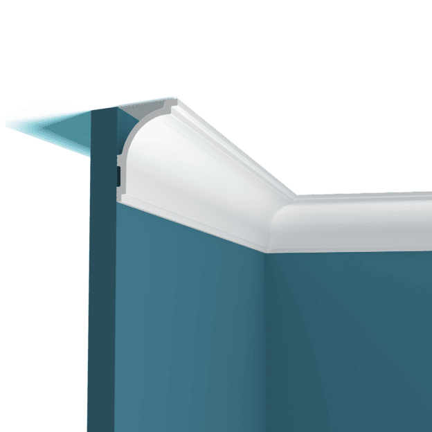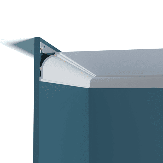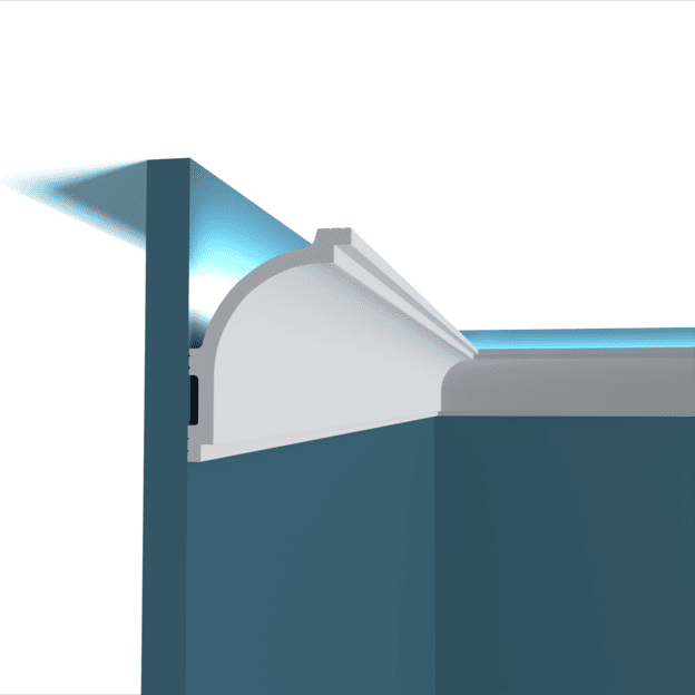 Плинтус Перфект Плюс потолочный P143 можно подходит под подсветку. Используют для декорирования стыка стенки и потолка, а также скрытой установки светодиодной ленты.