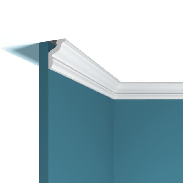 Плинтус Перфект Плюс потолочный P22 можно подходит под подсветку. Используют для декорирования стыка стенки и потолка, а также скрытой установки светодиодной ленты.