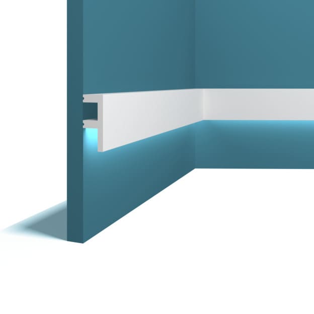 Плинтус Перфект Плюс потолочный P80 можно подходит под подсветку. Используют для декорирования стыка стенки и потолка, а также скрытой установки светодиодной ленты.