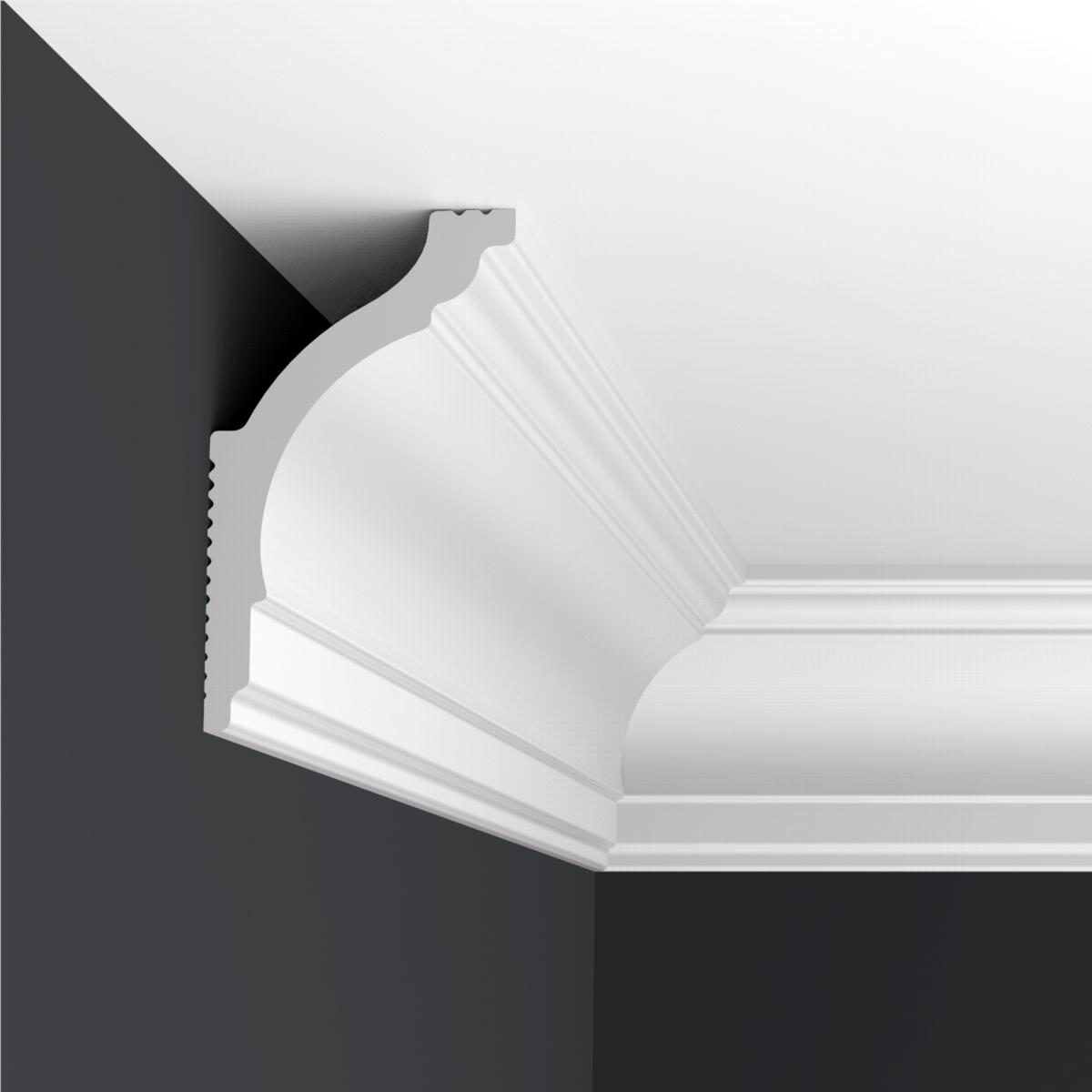 Потолочный плинтус дюрополимер Формат 08018D произведен из дюрополимера – это вспененный композитный полимер получаемый из пенополистирола под высоким давлением.