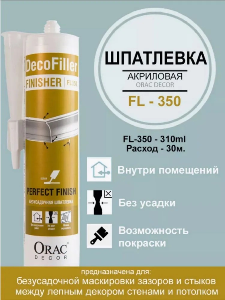 Шпатлевка для лепнины Orac FL350 DecoFiller 310 мл на водной основе предназначена для ремонта и отделки зазоров (стыки между двумя профилями, между стеной и профилями), трещин и неровностей в профилях. Однородная масса без посторонних включений белого цвета со слабым специфическим запахом. Готова к окрашиванию через 2 часа. Не трескается, перекрашивается после полного высыхания. Рекомендуемая толщина слоев - 1-2 мм. Для внутренних работ.